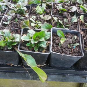 Low growing perenial dark bronze leaves and spikes of blue flowers